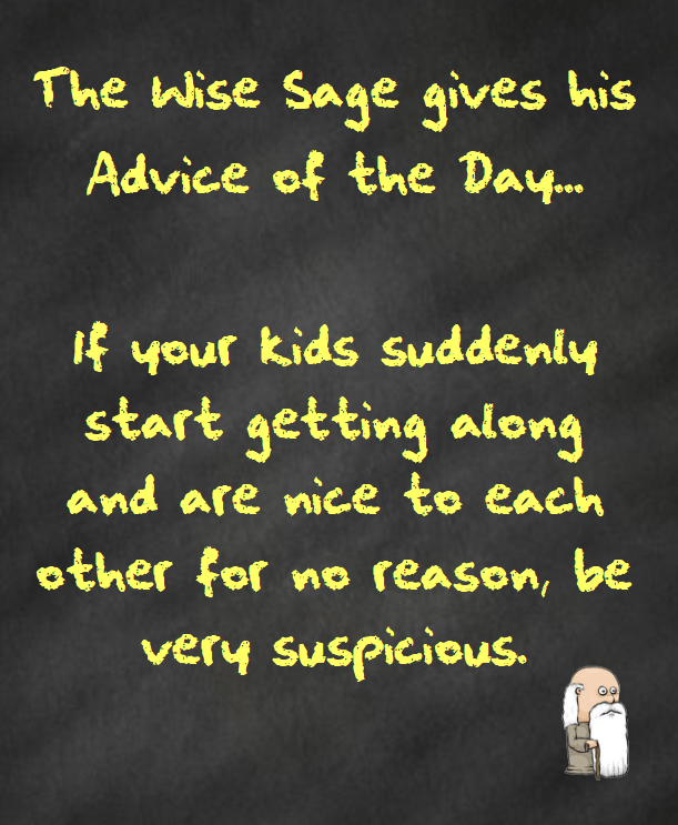 If your kids suddenly start getting along and are nice to each other for no reason, be very suspicious.