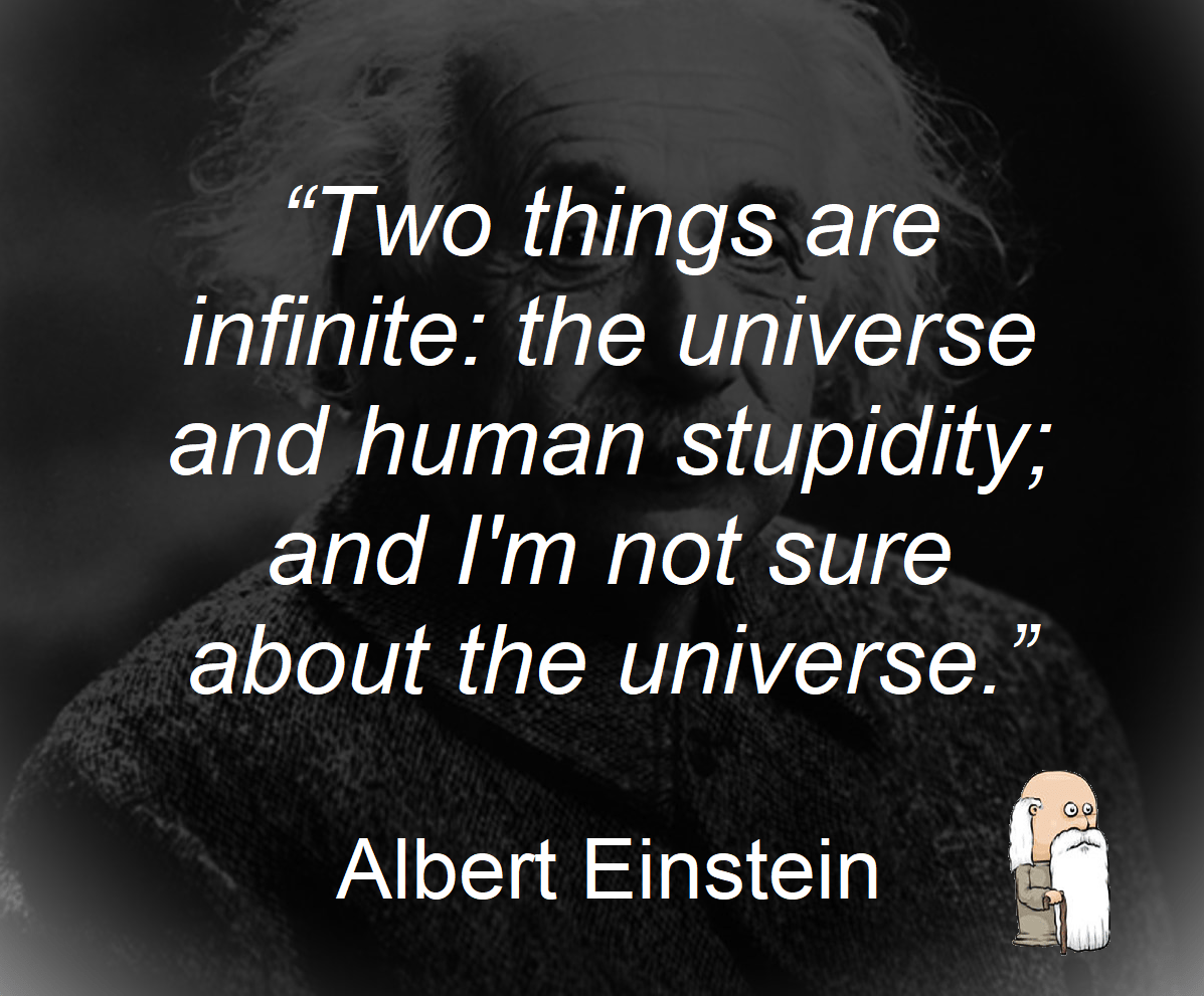 “Two things are infinite: the universe and human stupidity; and I’m not sure about the universe.” Albert Einstein You’ve got to love this quote! Albert takes a comical swipe at man’s sanity and questions his own theories as a juxtaposition! Brilliant. With war, global warming, dictators, epidemics, and famines I make Albert right …. whatContinue reading “Quote of the Day: Infinity and Stupidity”